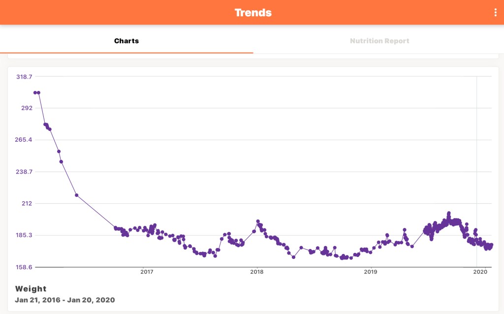 In the first year of being ketogenic I dropped fairly quickly, and have pretty consistently maintained into a fifth year. See more charts here